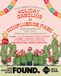 Now here’s where y’all come in! Join us for an hour of caroling for everyone—sí, everyone. No experience needed, just your voice and a smile. SARF’s very own Pamela Martinez will lead us in caroling with help from guitarist Terry Hankins. We’ll have a few song sheets on hand, but bring a device to peek at lyrics just in case. I’ll bring some tambourines for those of you who really like to get a little rowdy!