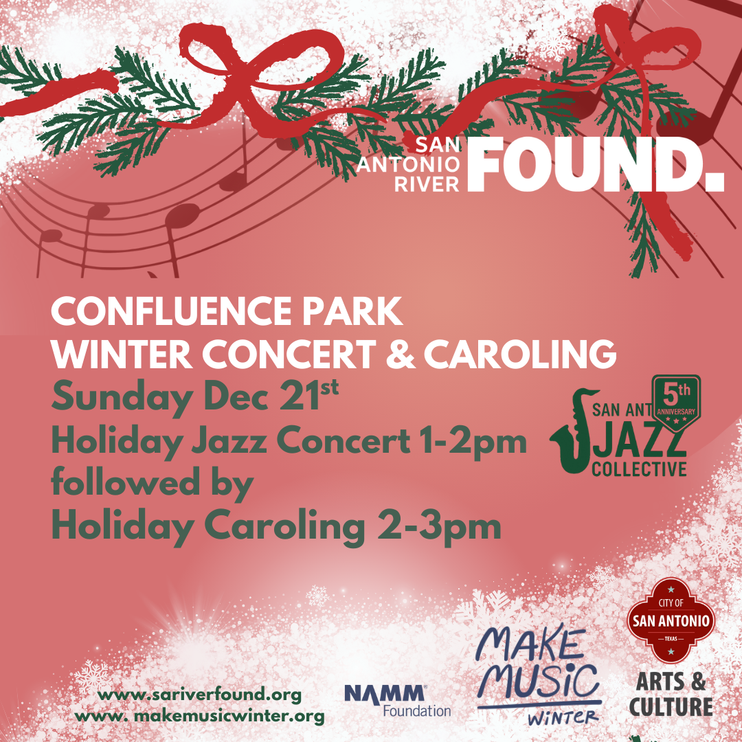 Start up your holiday spirit with the SA Jazz Ensemble as they fill Confluence Park with warm, joyful tunes. Bring a blanket, bring a friend—just don’t forget your holiday spirit.