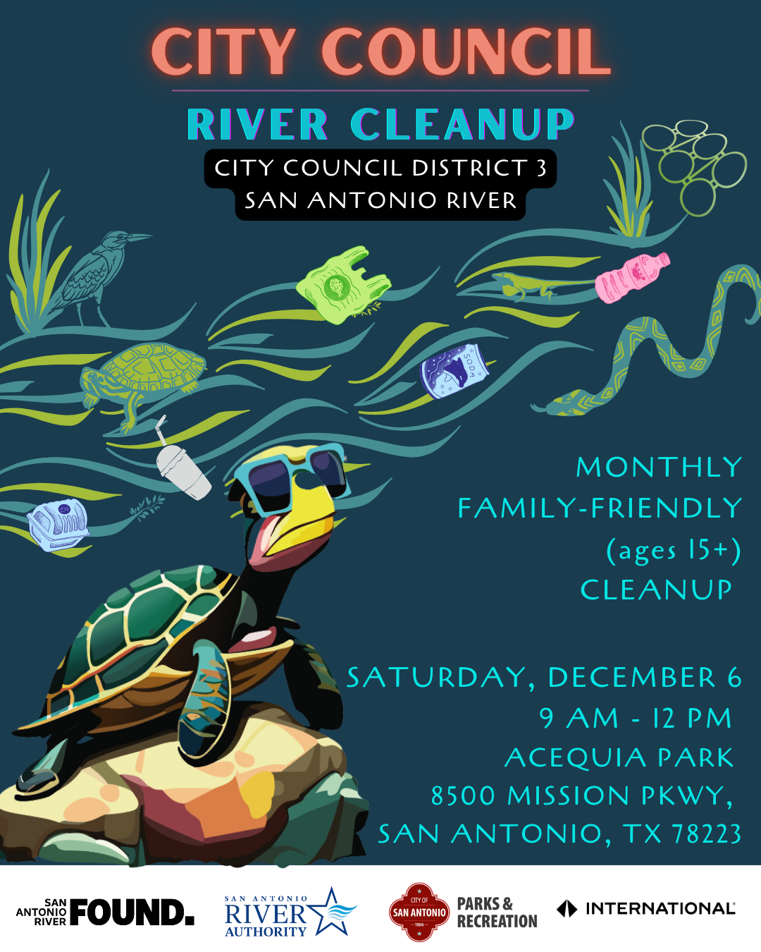 The San Antonio River Foundation, San Antonio River Authority, SA Parks & Recreation, and City Council District 3 invite you to help care for our San Antonio River on Saturday, December 6, 2025. Ages 15+ welcome.