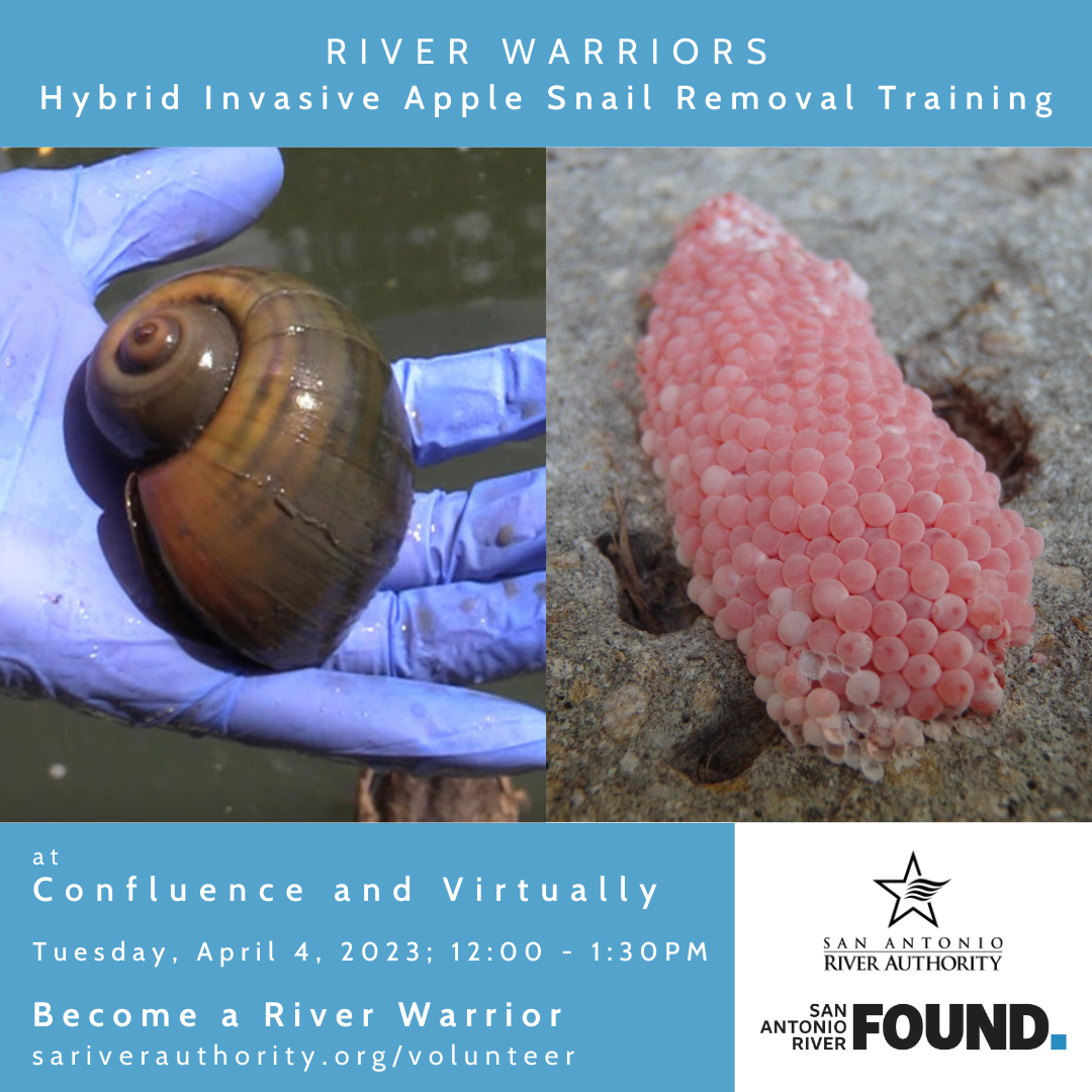 Apple snails are invasive species of snails from South America that are now seen in the San Antonio River. They are voracious eaters of native vegetation and threaten the health of the native species in our river. River Warriors and other community volunteers are invited to attend this training virtually or in-person to be certified to help remove these snails and their egg cases from the river on land or from kayaks on the water.